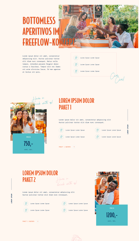 I came up with an introduction to the catering page, where first the Free-Flow concept is explained. Later the packages should be explained & to which event they are fitting. First the Booking-Button was placed on each section, but we later had problems implementing it like that due to a third-party tool the client decided to use. The Booking-Button is now sticky on the page.