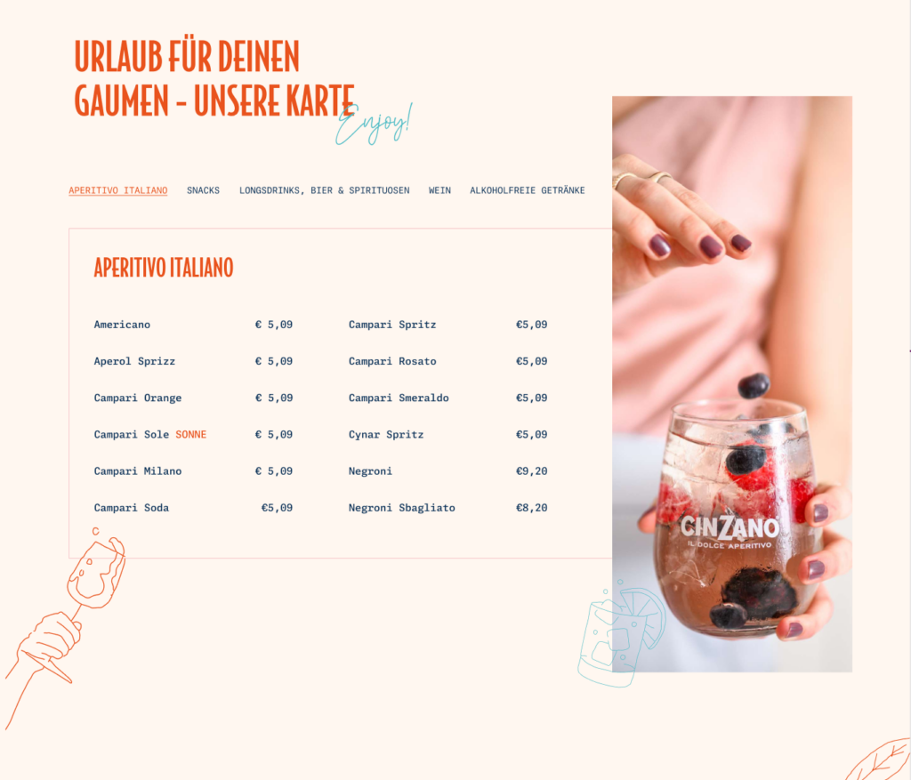 I also liked the idea of the illustrations being animated when interacting with a CTA using the orange grain background, which simulates Aperol.